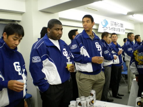さてさて、会社の隣りのビルの激励会会場に行くと、すでに人でいっぱいっっ<("O")> 選手たちはまだ来ていませんでしたが、落合監督や谷繁さん、田村コーチら一部の人はもう来ていました。ほどなく、選手たちが到着し、入場で~す!