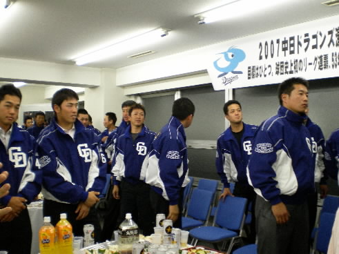 ▲先頭で入ってきたのは宇野コーチ! 続いて森、近藤コーチらスタッフが入ってきて、その後には立浪さん、福留さん、井端さんに荒木さん~森野くんら選手たちぃ。おっ 「育成選手」の中村ノリさんもいますねー(^O^) 昨年末に結婚式にお呼ばれした普久原くんも一軍にいるのでちゃんといて、「お~!」って感じで(^^) その結婚式で一緒だった、渡辺博幸さんや、中里くん、澤井くん(^_^) 新人では日本福祉大からきた浅尾拓也くん。外国人選手ではタイロンウッズに韓国からきた李選手などなど。