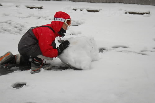 私も汗だくですよ~ 最近、こんな汗かいたことない(^_^; 明日筋肉痛出そう(-.-) 女神もなかなか工夫しながら雪を集めてきます。口ほどは集められないんですけどねf^_^; でもでも、やっぱ一番働いたのは小僧ですね(^o^) こういうときには俄然張り切り、俄然燃えます。あちこちで雪を丸めて大きくしては運んできます。この集中力、このやる気、他のことにも発揮してほしいと思いつつっっ