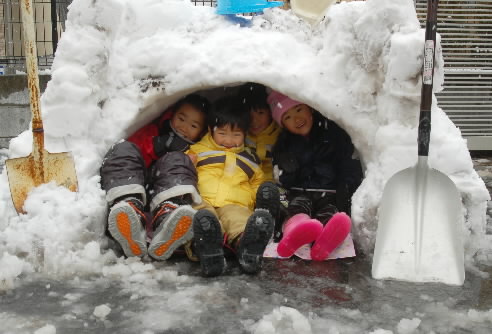 ▲そして、これが完成品!! 最後の方、ソリで雪を運んできてくれた近所のお友達も一人入り・・・二人入り・・・・みんなでパチリ(^O^)/ みんなあちこちびしょびしょになったけど、私も靴の中に雪が入って超冷たかったけど、それもまたいい思い出です(^_^)