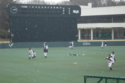学校が終わると走って帰ってきたのか、息を切らしている小僧くん、「行こう!!」と目を輝かすものの、あいにくの雪。でも、窓から覗くと、グラウンドでは選手くんたちが守備練習をしています。「やってるみたいだね」と二人で明大へ行ってみました~