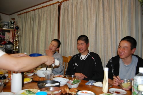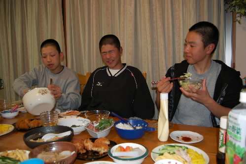 そんな話しをしながら、さらに食べる3人! と、まず、いつも笑顔のキャプテン日比くんから笑顔が消えましたf^_^; 「もう、ヤバイです(-"-;) もう食べれない・・・・(-.-)」 「なっにぃぃぃ~ 早すぎだろ!Σ( ̄□ ̄|||;」 ご飯がまだ残ってる!!ってことで、監督から、「これを三等分して食べればちょっとじゃないか!」って3人のさらにもられ・・・(左に見えるのが悪魔の手!(*´艸`))