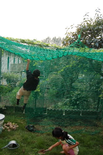 ▲自分のティーネットのところに植えたので、ティーネットの周りや上にゴーヤがたくさんできているんですっっ 上の方に成っているので、小僧はネットをよじ登ってゴーヤを必死にとってます(^_^;