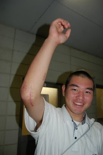 ▲4月に手術した肘の傷が痛々しい。。。本当に野球が大好きで、野球がやりたくてやりたくて仕方ない、野球小僧のミツグ。ワイワイと自主練を続ける選手たちを横目に「ヘタレになっちゃいました・・・」と下を向いていましたが、「まだまだこれからだよ!」と・・・。ここで焦ってやるよりも、じっくり治してからやろうよ! ね!