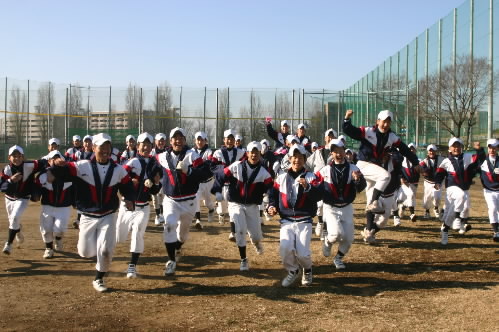 ▲まずはランニング! 人数多いですけど、足並みそろっていて気持ちいいですねー。上は2年生、下は下級生。「ランニングの下手なチームに強いチームはない! ランニングがうまいチームに弱いチームはない!まずはランニングから!」という監督のもと、そうとう「ランニングの練習」していますっっ ちなみに、武蔵府中シニアは行進もすごくウマイです。