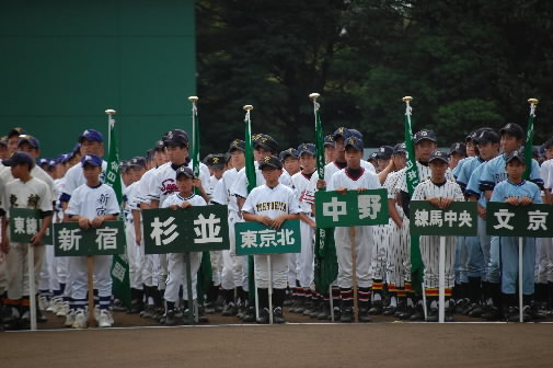 写真を撮りながら行進を見ていたんですが、突然、レンズ越しに見えるは帝京高校の行進!!! なんでていきょー?? と思ったら、もろに帝京デザインのユニホームを着た練馬中央シニアでしたっっ いやー帝京出身の方が新しいチームを作ったとは聞いていたけど、ユニホームがそのまんまやないのっっ☆(゜▽゜)☆ 胸の文字が「N chuo」となってるだけであとは全部一緒、いやーびっくり!
