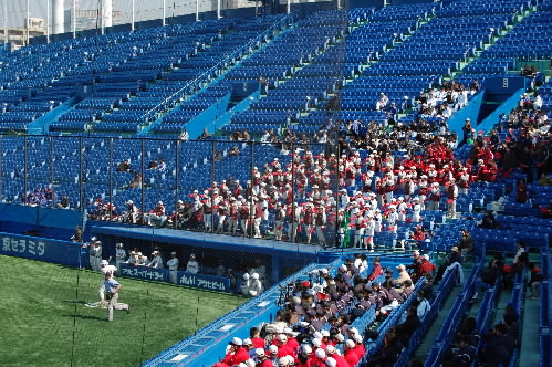 ということで、Tボールに参加する各リーグのチビーズたち、元気に黄色いタオルを振りながら入場し、レフト側からスタンドへ抜けていきました~ チビーズは長時間立ってられないんで、あとはスタンドでシニアやリトルの行進を見るんですね(*^。^*) あーかわいかったっっ(#^v^#)