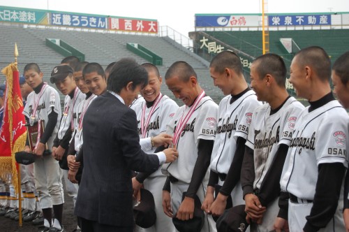 表彰式には阪神タイガースの赤星選手会長がきて、優勝旗、優勝カップが神戸中央シニアのキャプテン、副キャプテンに、選手全員にメダルをかけてくれました