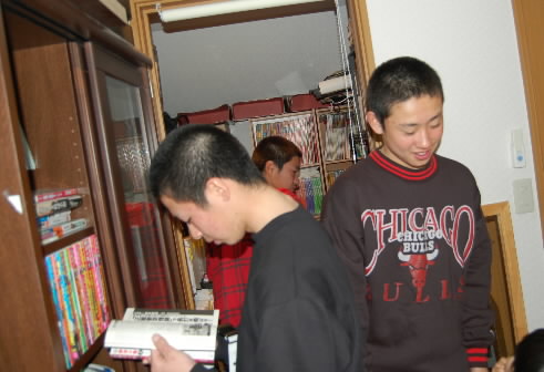 ▲食後はママ記者の仕事部屋にきて野球雑誌をペラペラと。中原くんが読んでるのは「中学野球小僧」かな? 野球本がい~っぱいあるので…(25年前ぐらいからの高校野球雑誌、ほとんどそろってます(^_^; 下手したら、みんなのお父さんが甲子園に出てるころの雑誌もあるかもよぉっっ) なので、みんなこの部屋に来ると目を輝かせます(*≧∇≦) 以前来た安丸くんは「ここにずっといたい!ここに住みたい」なんて言ってたくらい(^_^; 某有名高校のユニフォームやら、プロ野球選手(松坂、涌井、岩隈ほか!)や高校で活躍する選手(中田翔ほか)の中学時代の写真など、レアグッツもあるので、楽しいようですね(^_^)