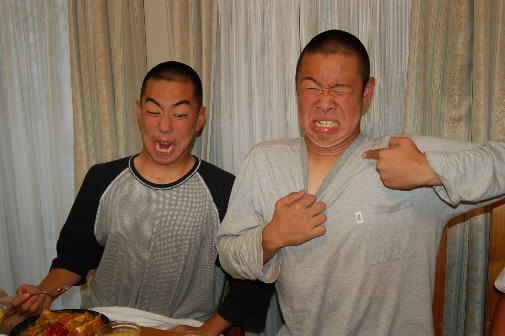 ▲みんなよく食べますっっ 左の写真、裏表に載せてるわけではないんですよっ 二人とも左利きなのですっ! 右の写真は、ご飯食べながらも笑わせてくれる二人は。。。「二重あご!じゃなくて『十重あご!』」だって~ あご、十段になってる??o(^ヮ^)o