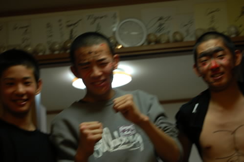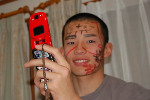 ▲佐伯くんもやられてますね~(*^。^*) 左の写真、書いてるのは監督っす! 記念に携帯で写真撮ってる佐伯くん、思い出の一枚?(;^_^A