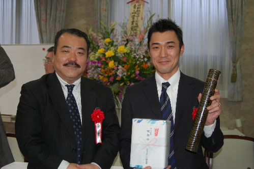 ▲代表で賞状を受け取る、左は豊島シニアの海老原丘監督。右は甲府南の中川巌監督、中川監督は理事としての表彰です。
