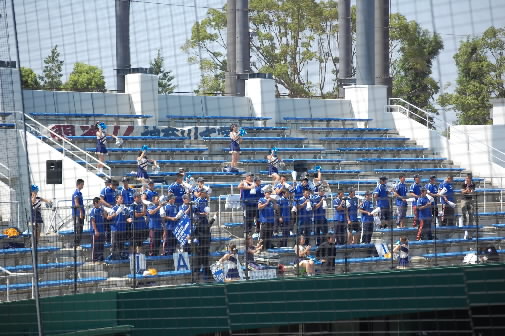その神奈川大は、応援団もチアガールもちゃんときていて、スンバラシー大応援!! かと思ったら、、、スイッチオン!で大応援の「音」をスピーカーを通して流しているのでありました~!!