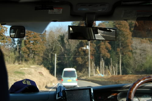 ▲この林の間のような道を抜けるとグラウンドにつきます! 車のフロント左には千葉経済の帽子です(^_^)