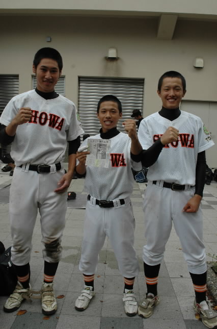 左から、大型キャッチャー、4番を打つ大河原くん、小さなキャプテン・和賀恭平くん、一番右が1失点完投の飯島稔浩くん! 大河原くんと和賀くんの身長差。。。。186-158=28センチ!