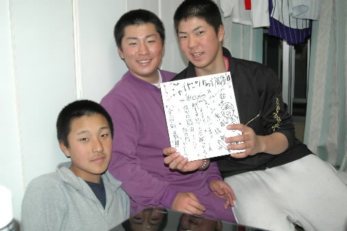 で、中学野球小僧の3人に1枚の色紙を書いてもらったら、、、、それぞれが名前と抱負を書いて、一番上にチームの目標を代表して白坂くんが書くことになり、、、みたら……「へ? ジャイヤンツカップってなにぃぃぃ~!!??☆(゜▽゜)☆」 「え? ジャイヤンツじゃ……?」「ジャイアンツだよ!!(゜~゜;)」