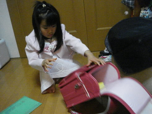 さっそくピンクのお洋服を着て、ランドセルを開けたり締めたりっっ(^o^)