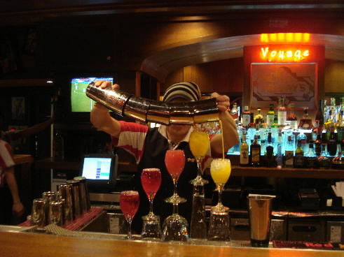 ▲カクテルを注文したときに、「フレアで作って!」っていうとやってくれて、最初はマイケルのフレア・ショー! 音楽をガンガンにかけて、技が成功すると仲間の店員さんが鐘(?)を鳴らして、お客たちも拍手しながら盛り上がる! 私はいきなり日本一のマイケルを見ちゃったので、それがどんぐらいスゴイのかわからないのですが、ありゃ、そうとう練習してるなっていうものばかりでした! さすが日本一! 来月、世界進出!! 右の写真のように、グラスにいろんなカクテルをついでいく技も素敵でした!