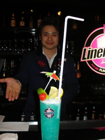 「TDIフライデーズ」はレストランですが、お次はカクテルバー。六本木ヒルズや東京ミッドタウンとは反対方向に歩いたところにある「Liner Flips」というお店。1階にあってガラス張りで、中丸見え! そこでは、さらに「火吹き」の技も見せてくれるとか!!