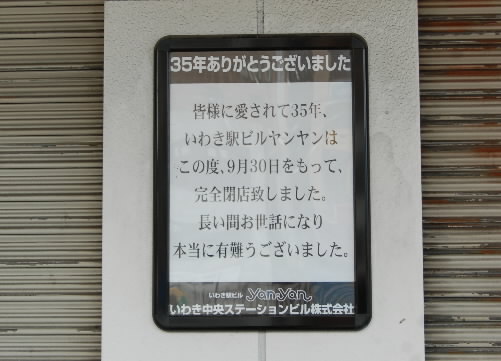 ▲いわき駅は変わるそうです・・・ いわき市民だったらみんなが知ってる「yanyan(ヤンヤン)」は閉店していました。初めて知ったのですが、ヤンヤンは私とだいたい同じ年生きてたんですね・・・