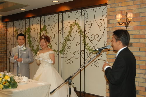 社長であるマッチャンが乾杯の挨拶をしたのですが、〝しゃべマツ〟と言われるくらい、いつもしゃべりまくってるマッチャンが、初の結婚式での乾杯の挨拶に、そーとー緊張したらしく、言葉につまるつまる(^_^;