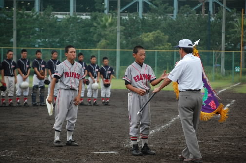そんな「大喜び」が一段落し、試合終了の挨拶をしたら、ベンチに戻らずそのまま表彰式に突入~ おぉぉ~なんと早い切り替えだっっ だいたい、試合終了後の挨拶後、一度ベンチ前に戻って、保護者に挨拶などして、もうひと呼吸おいてから表彰式は始まるのが普通ですが、なんと素早い開始だっっ!! 雨が降ってるし、第3試合に敗者戦もあったからですね(^_^;