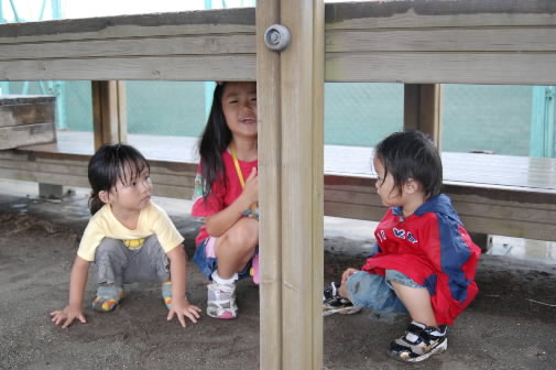 最初こそ、椅子に座ってスコアブック付のまね事してましたが、すぐに九十九シニア側にいたカイトくんという3歳の男の子と仲良くなり、さらに、我孫子シニア側にいたみーちゃん(?)という女の子とも仲良くなり、3人で応援スタンドの下にもぐって何やら遊んでいました(^_^)