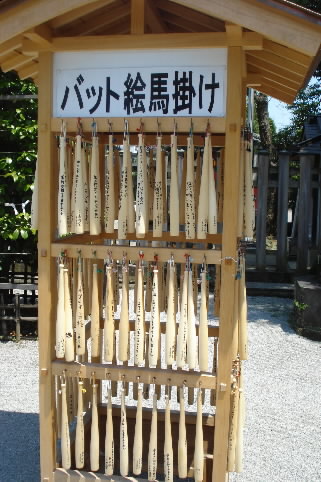 お守りを買うとき、巫女さん(?)に「ここは野球の神様を奉ってるんですか?」と聞いてみたら、「たままた知名が『やきゅう』というので、野球の必勝祈願などをしにくる方が多く、それで、このような絵馬を作った」とのこと。野球の神様が奉られているというワケではないのですね(^_^;