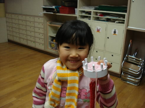 そして今日・・・女神ちゃまを保育所に迎えにいくと・・・・「ママ~できたよ~ マフラー!!」って。女神は、保育所でママのためにマフラーを編んでくれていたのです!! 編み棒で編むんじゃなくて、何ていうのかなぁ 子供でもできる筒状の編み物の道具を使って編んでいくやつっ(^^;;) それで毎日ちょっとずつ編んでくれていました!!