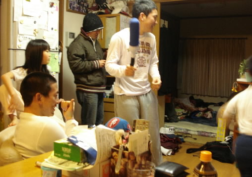 ▲その後は野球の体感テレビゲームに白熱!! 健介&小僧チームVS岡部&女神チーム! 勝ったのは~~健介チーム! ということで今度は岡部の顔に落書きです(^。^;) 写真は最後の方かなっっ メチャ部屋が散らかってるのが恥ずかしいf^_^; 奥の部屋にはもう布団敷いてますねっっ でもって、後ろに立ってるのは帰ってきた小坂コーチ!