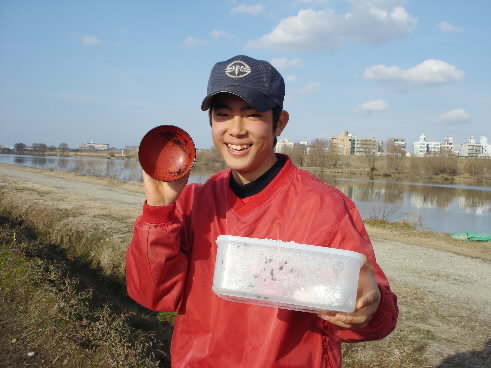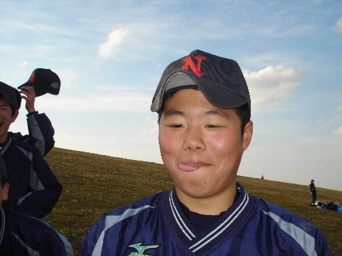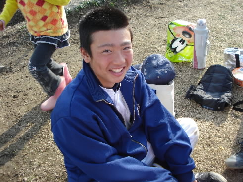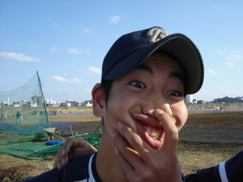 右の写真は、「アキタのおじいちゃん」こと夜行性の野嵜恵輔くん(新2年・サード) みんなによると、「つわもの」だそうです!