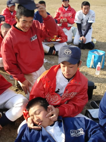 ▲みんなで元気にパチリ。右後方のジャンバー着てない選手くんは、昨夏、リトルで世界準優勝になった東京北砂リトルの金久保くん! 大人しいです(^_^; 右の写真は・・・・その後、昼寝タイムに入った井上くん、このカワイイ寝顔にだまされないように!(*´艸`)
