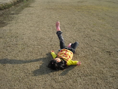 ▲気持ちいいので、ゴロンとしてしまいました~!! って、芝の下は、まだ水分が(゜~゜;) 服はなんとか無事でしたが、この後、長靴を脱いで靴下で走り回ったりしていたので、靴下が真っ黒になってしまいました|(-_-)| ま、洗えばいいや~(^_^;