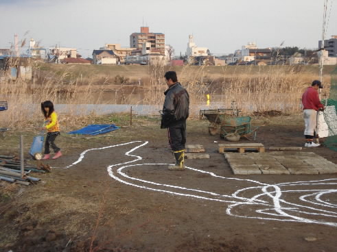 ▲ライン引きの練習??(^。^;) こりゃ楽しい! けど、こりゃ粉の無駄遣い?(^^;;) お隣にいる長靴を履いてるのが荒川シニアの石墳事務局長! 石墳さんのご好意により遊ばせていただきました! 消耗品を消耗させてしまってすみませんっっ!!&ありがとうございます!!