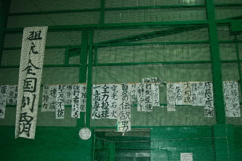 ▲その正面玄関を入って、その「栄冠の数々」の向こう側に、オレンジっぽい建物が・・・。と、山本監督が「あれが寮なんですよ! 野球部とサッカー部が入ってます」と。え~っっ 寮が学校の敷地内にあるんですか! それも中庭というか、真ん真ん中にっっ これじゃ、1分で教室行けますね(^o^)