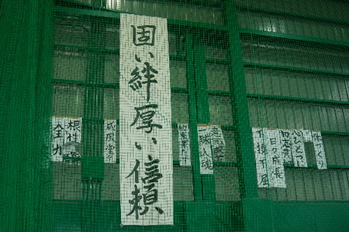 ▲立派なグラウンドですね~ 外野後方が山なので、自然でできたバックスクリーンというか、山に向かって打ち返すっていうか、こりゃ~いい環境ですっっ ブルペンはネット裏に3人投げられるところがありますが、ライト後方にも今、4人投げられるブルペンを作っているとか! それはここのOBで大阪ガスから阪神にドラ1で入った小嶋達也投手からの寄付だそうです~