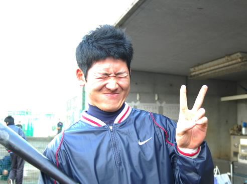 で! 「体重何キロ?」に、「シニアんときも、一番最初にそれ聞きましたよね~(*- -)」って(^。^;) 「あ、ゴメンゴメン! 登録の『104キロ』っていうのがホントかなと思って(*^。^*)」に、「ホントっすよ~!」「3キロ少なく申告してるっていうウワサもあるけど(^.^)」に、「今はウエイトをあげていく時期なんで! でもベストは100かな~」と解説してくれました~ でも、右の写真のように、体型のわりには(?)動きがいいんですよ!! パワーももちろんスゴくて、打球の飛距離はスゴイっすよ~