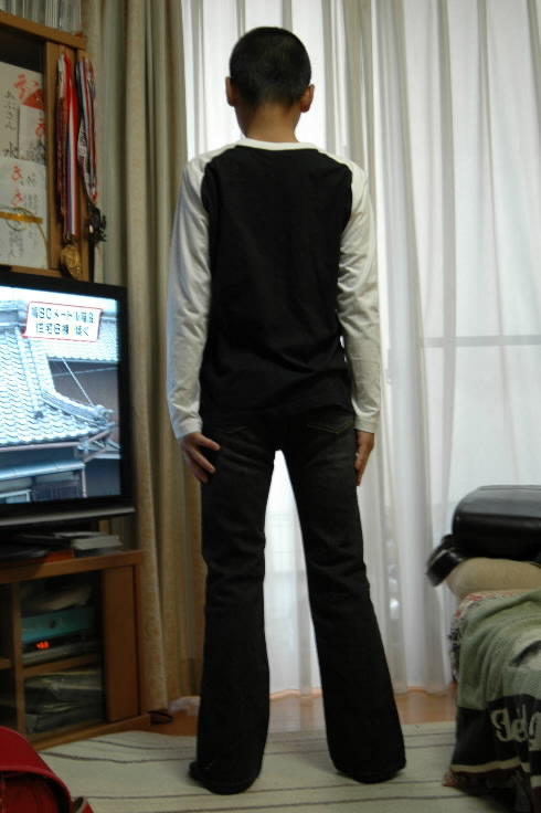 最初は「え~ こんなカタイのGパンって~」とぼやいてましたが、何本か試着してみると、「これいい!」って。ストレッチ素材で、なかなか伸縮性があるものを気に入ったみたい! で、今までは「小僧、足みじか~(-_-)」と思ってましたが、Gパンはくと、意外にも足が長く見える!! うわ~小僧、カッコいいよぉ~ん!!
