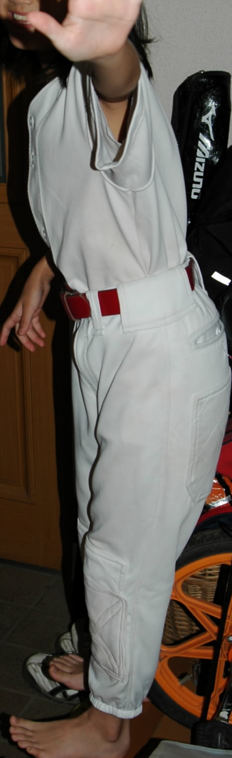 女神ちゃまは、「え~ ユニホームぅ~(:_;)」と乗り気じゃなかったのですが、「仕方ないじゃーん、白いズボンないんだから~」と、小僧の上下練習ユニホームを出してきて、無理無理女神に着せてみた!!