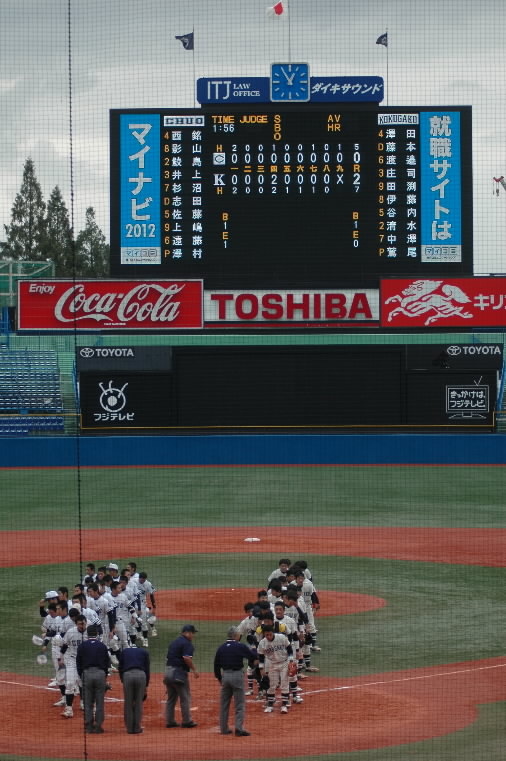 4回裏の国学院大の2点は、4番の庄司輔くんがライト前、澤村拓一くんのけん制エラーで二進、次打者の田渕雄飛くんが送って1死3塁とし、6番・畠山翔平くんのセカンドゴロの間に三塁走者の庄司くんが返って先制。澤村くん、畠山くんのバット、へし折ったんですけどね~ さらに、谷内亮太くんの左中間タイムリー二塁打でもう1点。この2点で決まっちゃうなんてね~
