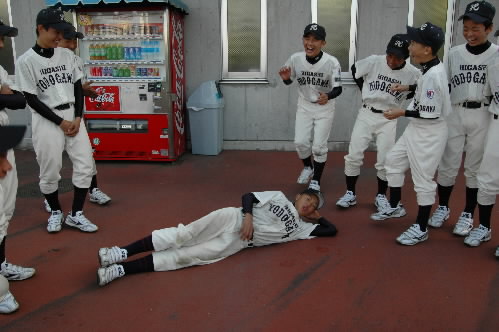 ▲「次は誰~?」に、みんなが「オゼキ~」って。そしたら、1年生の尾関一旗くん、「オレ? オレ? オレはレギュラーじゃないからダメです~!!(≧ε≦o)」って逃げだそうと! 「でも、そんなのかんけーねー!」ってことで、右の写真です! エース藤本鈴也くんと「ガリガリ!」 (・∀・)