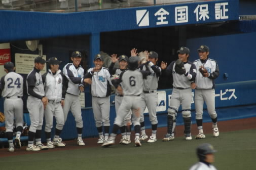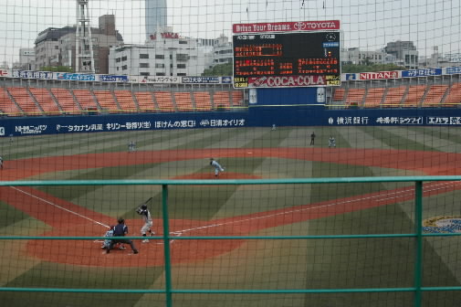 スタンドの観客は・・・・かなり、まばら。雨が降っているからか、それとも毎回このぐらいなのか。。。 応援も、神奈川大には10人ほどのチアと、控え選手20人ぐらいで成る応援団がいましたが、横浜商大の方は控え部員が鉄平のようにあちこちで裏方お仕事をしているためか、応援は10人いるかいないか。ちょっと寂しいけど、まぁ仕方ないっ