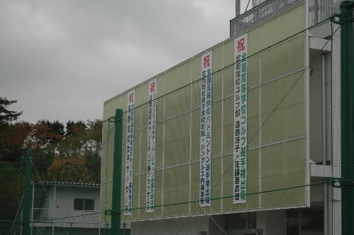 ▲これはJヴィレッジではなく、富岡高校のグラウンドです! きれいです! 右の写真は全国大会出場などを祝う垂れ幕。一番手前の垂れ幕に、佐藤亜衣理さんの名前もあります! 一番向こうは女子サッカーのもの