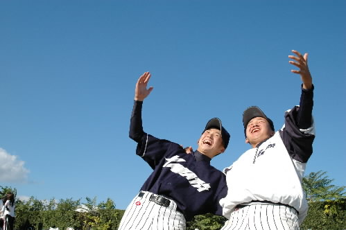 ▲ショート柏木俊孝くんとライト原口大地くんも、澄み切った青い空に向かって喜びのパフォーマンス!