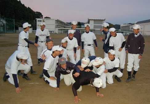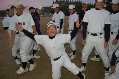 ▲2年生の集合写真です! で、右の写真のように盛り上がっていたら、一人、まだ練習にきてなかった選手がきた~! と中央の選手くん、気づく!