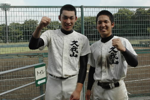 ←修徳打線を3安打完封し、勝利に導いた国学院久我山の1年生バッテリー、川口貴都くん(所沢南シニア卒)と菊池泰志くん(軟式・東村山パワーズ卒)。なかなかの頭脳派コンビです(^.^) 菊池くんも2回に盗塁刺して川口くんを援護!