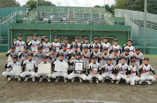 左から、大型キャッチャー、4番を打つ大河原くん、小さなキャプテン・和賀恭平くん、一番右が1失点完投の飯島稔浩くん! 大河原くんと和賀くんの身長差。。。。186-158=28センチ!