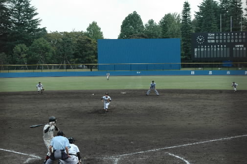 終盤にさしかかったころ、「じゃ、神宮に移動しますね~」と某スカウトさんっ うぉぉぉ~ 私もそっち行きたい!! 明治対法政の3回戦、私も行きたい!! 加賀美くん対ノムさんの投げ合いみたい!!(≧ε≦) が、、、、子どもが待っちょるので神宮までは行けませぬ。。。(涙っ) ま、もともと今日は多摩一本杉で2試合見る予定にしていたので、そのままそこに残り八王子対郁文館ました!