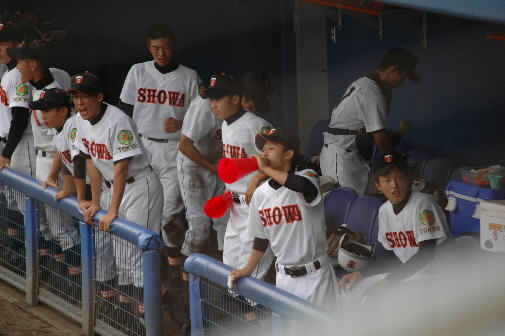 ←← この試合でとっても気になったのが、右手人さし指に包帯を巻いた都立昭和のキャプテン・和賀恭平くん!(立川ポニー卒) 試合中、赤いメガホンを持って、ずーーーーっと大きな声を出し続けています!