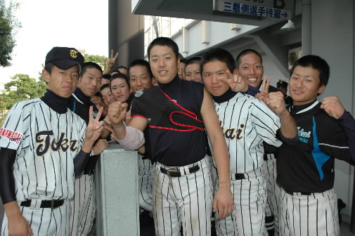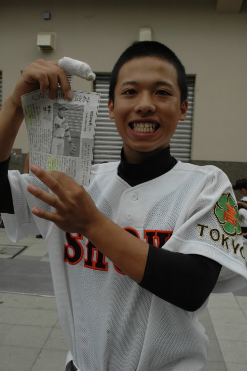もう一人、「僕のことは覚えてますか~? どこのチームだったか覚えてますか?」という選手くんも。「もちろん覚えてるさ~ ヒガネリの坪井くん!!」 ちゃんと覚えてるさ~ 坪井くんはヒガネリでタクロー(帝京)とバッテリーを組んでました。今はケガをしちゃってますが、来春、来夏はきっと出てくることでしょう!!